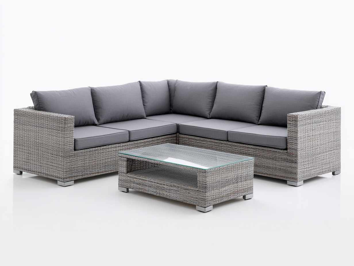 Ce salon de jardin d’angle gris propose une assise confortable et une table basse assortie pour vos moments de détente.
